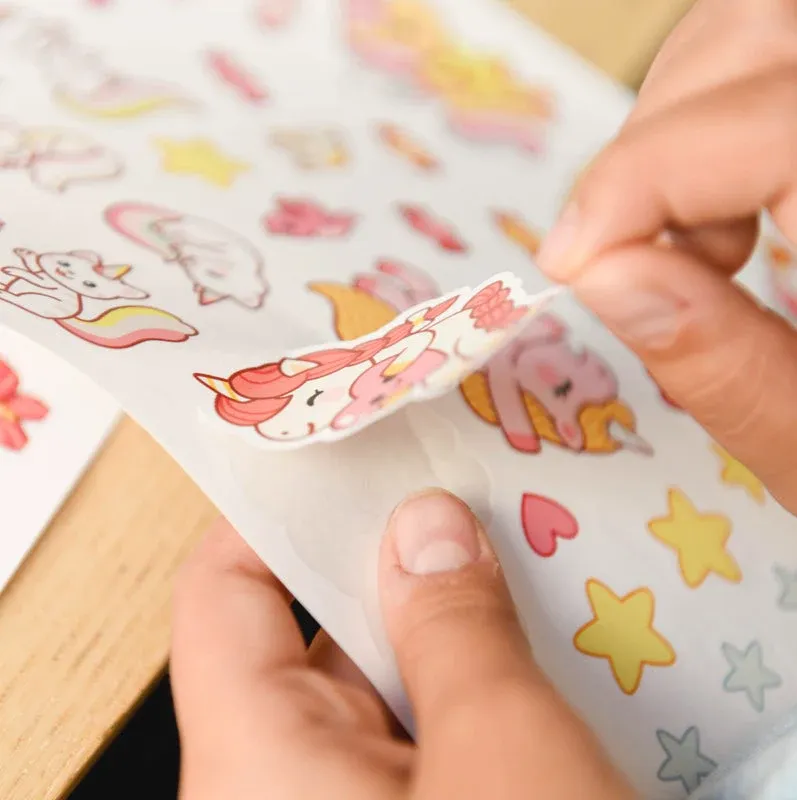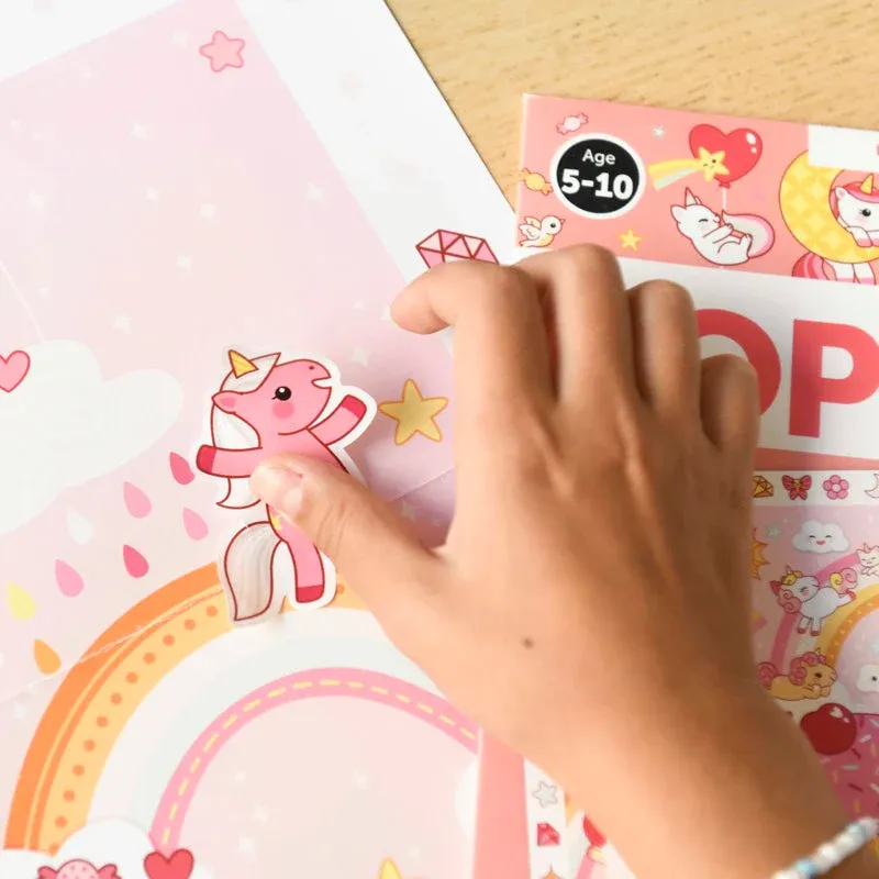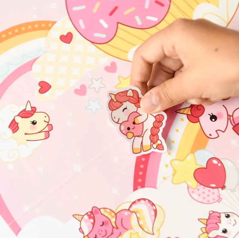 Το παιδί ξεδιπλώνει την αφίσα και κολλάει πάνω τους αστείους μονόκερους, ενώ εφευρίσκει τις δικές του ιστορίες. Τα αυτοκόλλητα είναι ημι-επανατοποθετημένα, ώστε να μπορούν να αντικατασταθούν μία ή δύο φορές. Εάν είναι απαραίτητο, παρέχεται ένα παράδειγμα στο πακέτο. Μόλις ολοκληρωθεί, αυτή η υπέροχη αφίσα θα μπορεί να διακοσμήσει το δωμάτιο!